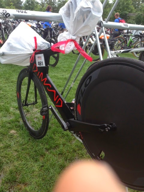 Into transition, and it was a muddy mess. Still frustrated over my swim, I arrived at my bike, which wasn’t hard to find since it was the only one left on the rack. If there was any place I was going to make up time it would be on the bike.